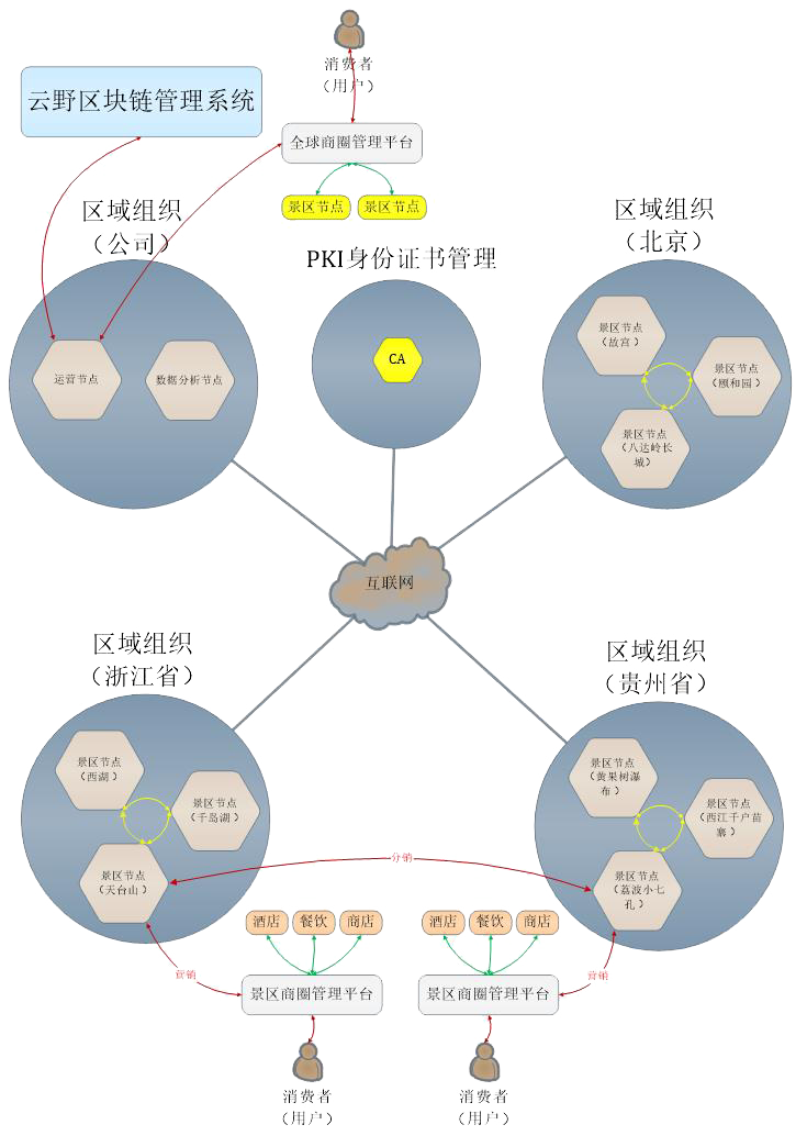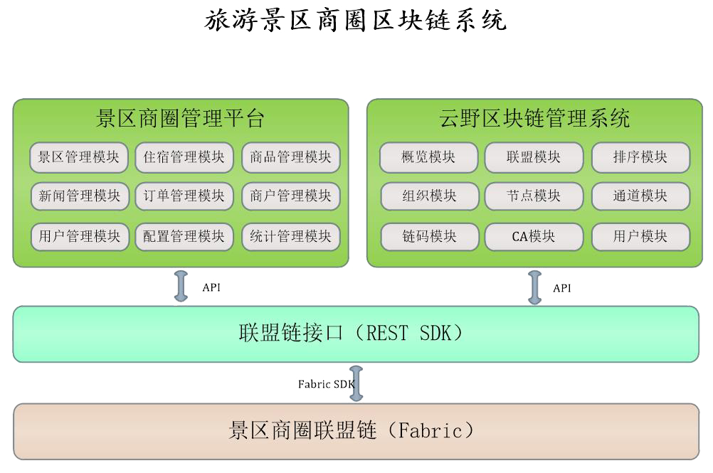 旅游景區(qū)商圈區(qū)塊鏈系統(tǒng)是建立在Hyperledger Fabric聯(lián)盟鏈區(qū)塊鏈基礎(chǔ)之上,以景區(qū)作為節(jié)點(diǎn),實(shí)現(xiàn)以景區(qū)為中心的商圈管理系統(tǒng)。本系統(tǒng)分為景區(qū)商圈聯(lián)盟鏈、聯(lián)盟鏈接口和景區(qū)商圈管理平臺(tái)三大子系統(tǒng)。