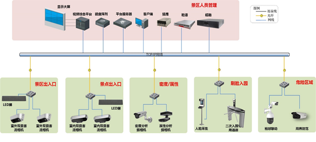 系統(tǒng)主要由雙目客流攝像機、LED顯示屏等組成,所有設(shè)備通過網(wǎng)絡(luò)方式進行連接,所有的數(shù)據(jù)及信號通過內(nèi)部網(wǎng)絡(luò)上傳到監(jiān)控中心進行存儲及管理。前端的崗?fù)し挚刂行目蓪崟r對各種設(shè)備做應(yīng)急管理控制,以應(yīng)對相關(guān)的緊急情況,后端平臺主要承接統(tǒng)計分析及應(yīng)急指揮的工作。
