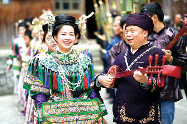 △ 2018年1月17日,在貴州榕江縣寨蒿鎮(zhèn)扒王村宰管侗寨,侗族群眾身穿盛裝參加侗年踩歌堂活動(dòng)。王炳真攝