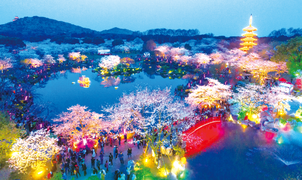 △ 武漢櫻花繽紛醉游人,東湖櫻花園在夜間開啟裝飾燈光,2018年3月26日,無人機(jī)拍攝下游客在夜色中賞櫻的畫面。熊琦攝