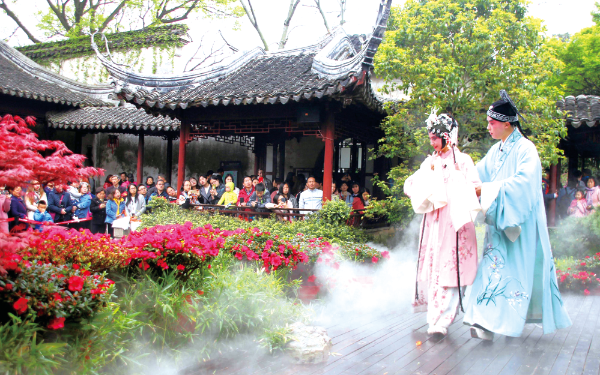 △ 2018年4月5日,2018“留園尋夢(mèng)”吳文化特色游活動(dòng)在蘇州古典園林留園啟動(dòng),昆曲、評(píng)彈、古琴等地方特色表演,向中外游客展現(xiàn)地方風(fēng)情。王建康攝