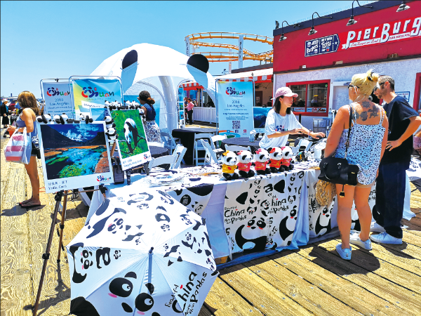 △ 2018年6月28日,在美國洛杉磯圣莫妮卡海灘進(jìn)行了四川旅游宣傳,以熊貓走世界美麗四川活動(dòng)為背景,熊貓彩繪DIT活動(dòng)吸引了不少當(dāng)?shù)厝罕娂坝慰汀?/p>