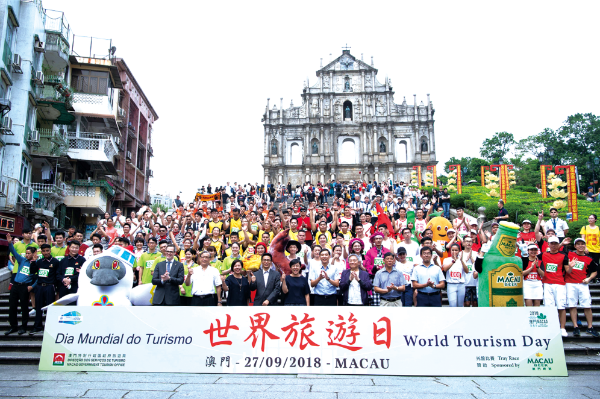 △ 2018年9月27日,澳門舉行托盤比賽慶祝世界旅游日。圖為嘉賓與參賽者在大三巴牌坊前合影。張金加攝