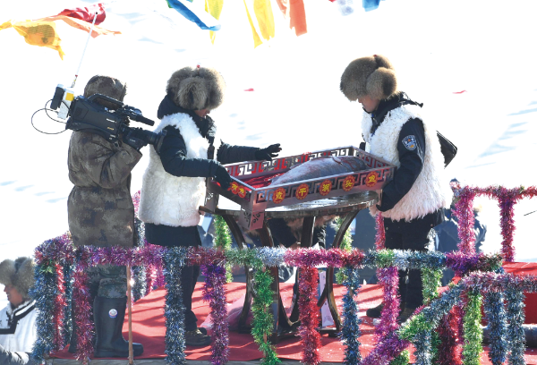 △ 2018年12月28日,查干湖冰雪漁獵文化旅游節(jié)在吉林松原拉開帷幕,數(shù)萬海內(nèi)外游客冒著嚴(yán)寒趕到現(xiàn)場(chǎng)觀看“冰湖騰魚”勝景。張瑤攝