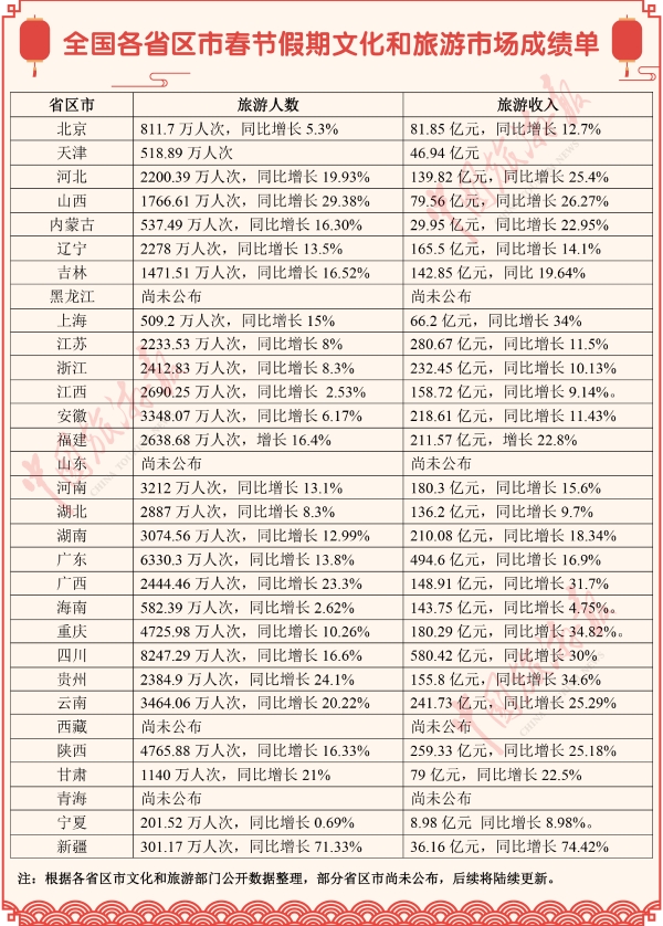 連日來,全國(guó)各省區(qū)市文化和旅游部門陸續(xù)發(fā)布了2019年春節(jié)假期文化和旅游市場(chǎng)主要數(shù)據(jù),小編收集整理了相關(guān)數(shù)據(jù),讓我們一起來看看這份亮麗的成績(jī)單吧!