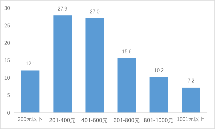 專項(xiàng)調(diào)查數(shù)據(jù)顯示,夜游花費(fèi)在200-400元和400-600元之間的比重最高,分別為27.9%和27%,600-800元和200元以下居中,分別占比15.6%和12.1%,1000元以下比重最低。