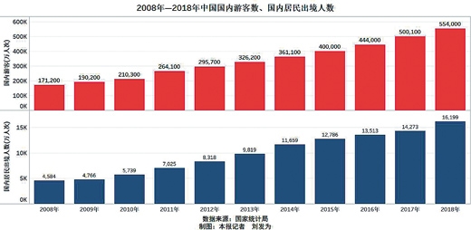 十年間,我們在旅途中的時間越來越多,也有越來越多的人踏上旅途。據(jù)國家統(tǒng)計局?jǐn)?shù)據(jù)顯示,2018年中國國內(nèi)游客出游55.4億人次,這一數(shù)據(jù)是2008年17.1億人次的3倍還要多;2018年中國居民出境人數(shù)達1.62億人次,而在2008年只有4584萬人次。