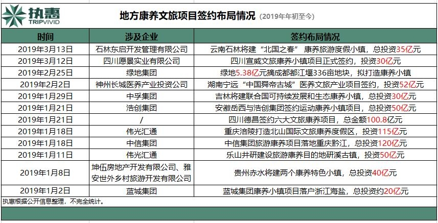 與此同時(shí),地方多個(gè)省市康養(yǎng)文旅項(xiàng)目簽約正在提速。執(zhí)惠統(tǒng)計(jì)的信息顯示,2019年年初以來(lái),重慶、云南、四川、湖南、安徽、浙江等地陸續(xù)簽約布局康養(yǎng)類旅游小鎮(zhèn)項(xiàng)目,數(shù)量高達(dá)12起,總簽約金額近650億元,包括綠地集團(tuán)、藍(lán)城集團(tuán)、中信集團(tuán)等企業(yè)。其中金額最大的要屬中信集團(tuán)簽約的三塘蓋國(guó)際旅游康養(yǎng)度假區(qū)項(xiàng)目。今年1月,重慶黔江區(qū)政府與中信集團(tuán)全資子公司——中信正業(yè)簽約三塘蓋國(guó)際旅游康養(yǎng)度假區(qū)項(xiàng)目,總投資達(dá)120億元,規(guī)劃區(qū)面積29平方公里。