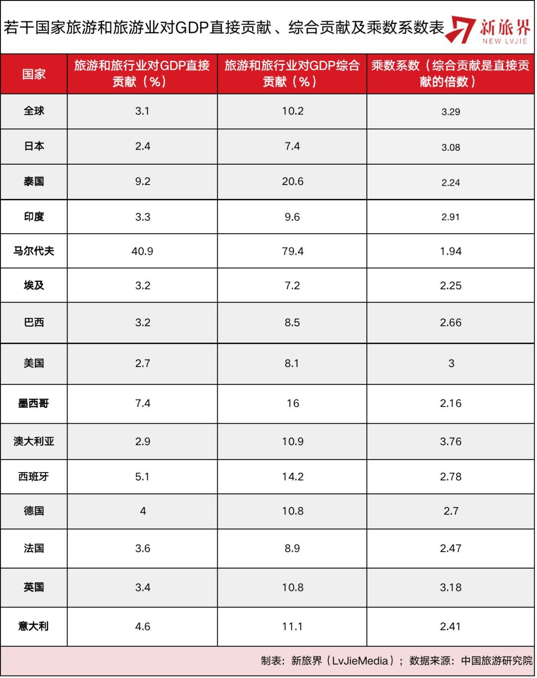 2016年全球旅游業(yè)對GDP的直接貢獻(xiàn)為3.1%,對GDP的綜合貢獻(xiàn)全球平均為10.2%,乘數(shù)效應(yīng)為3.29。