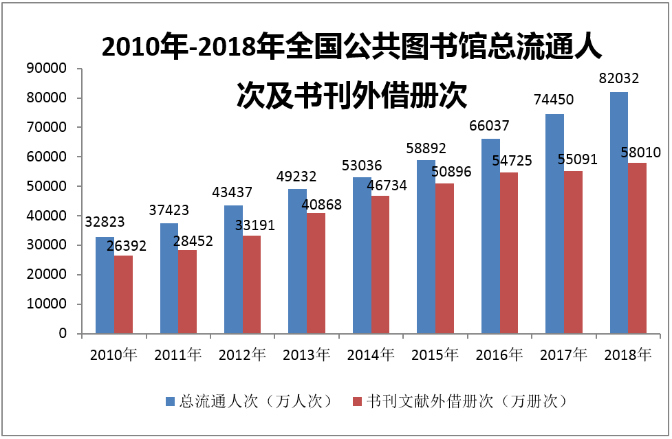 全年全國(guó)公共圖書館發(fā)放借書證7263萬(wàn)個(gè),比上年增長(zhǎng)7.8%;總流通人次82032萬(wàn),增長(zhǎng)10.2%。書刊文獻(xiàn)外借冊(cè)次58010萬(wàn),比上年增長(zhǎng)5.3%;外借人次25814萬(wàn),比上年增長(zhǎng)1.2%。全年共為讀者舉辦各種活動(dòng)179043次,比上年增長(zhǎng)15.1%;參加人次10648萬(wàn),比上年增長(zhǎng)20.2%。