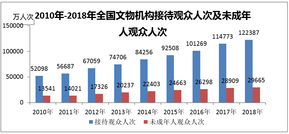 2018年全國(guó)各類文物機(jī)構(gòu)共舉辦陳列展覽27919個(gè),比上年增加1874個(gè)。其中,基本陳列13676個(gè),比上年增加651個(gè);臨時(shí)展覽14243個(gè),比上年增加1223個(gè)。接待觀眾122387萬(wàn)人次,比上年增長(zhǎng)6.6%,其中未成年人29665萬(wàn)人次,增長(zhǎng)2.6%,占參觀總?cè)藬?shù)的24.2%。博物館接待觀眾104436萬(wàn)人次,比上年增長(zhǎng)7.5%,占文物機(jī)構(gòu)接待觀眾總數(shù)的85.3%。