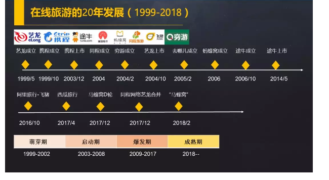 這是一張在線旅游發(fā)展關鍵節(jié)點的時間圖,大致可以分為4個時期,從1999年攜程藝龍成立的萌芽期,到2003年-2008年間的啟動期。