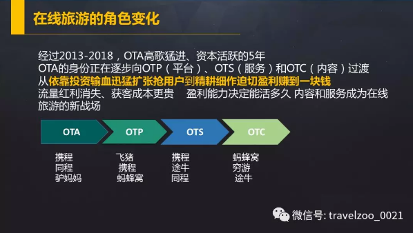 在線旅游已經從單純OTA(代理)到OTP(平臺)到OTC(內容)到OTS(服務)多種模式并存和角色的遷移,只做賣貨渠道的公司,已經沒有持續(xù)生存的空間。