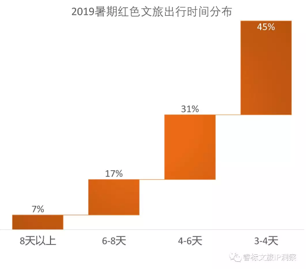 出游時(shí)長方面,多數(shù)旅客出游時(shí)長在4-6天,出游人次占比為45%;其次為3至4天中短途游,占比為31%;17%的旅客出游時(shí)長在6-8天,僅有7%的旅客出游時(shí)長超過8天。