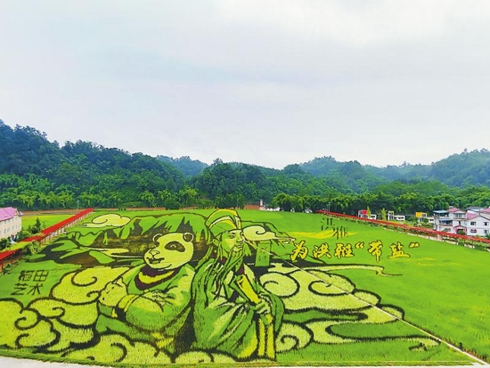 8月1日,洪雅縣東岳鎮(zhèn)橋口村的120畝巨型稻田畫,蘇東坡與大熊貓成為“主角”。
