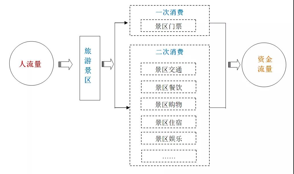 旅游景區(qū)轉(zhuǎn)化人流量的一次消費(fèi)與二次消費(fèi)是顯而易見的。旅游景區(qū)是通過門票形式進(jìn)行的一次消費(fèi),實(shí)現(xiàn)的景區(qū)人流量向景區(qū)資金流量的轉(zhuǎn)變。