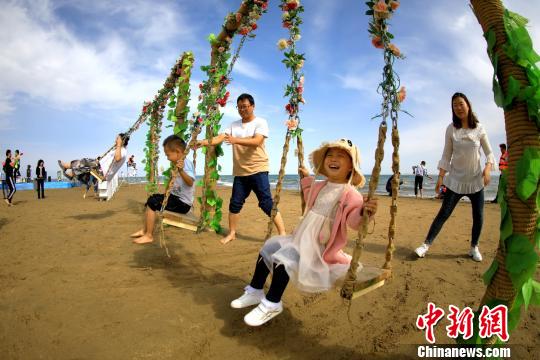 游客在博斯騰湖畔體驗(yàn)蕩秋千。 何陽 攝