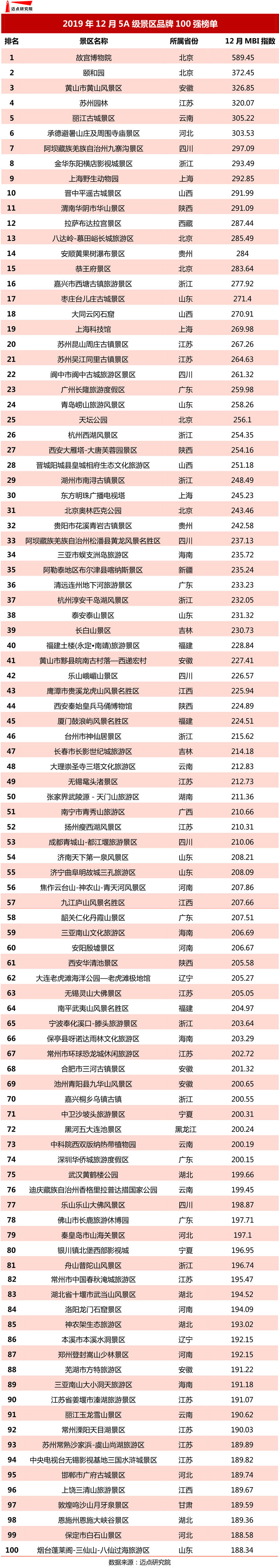2019年12月5A級景區(qū)品牌100強榜單發(fā)布