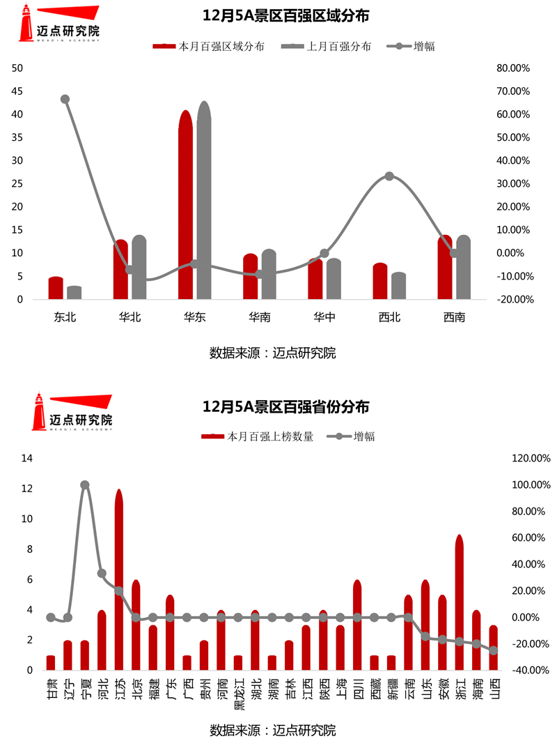環(huán)比上月,本月華北、華東及華南地區(qū)市場熱度減退,但東北和西北地區(qū)上榜景區(qū)數(shù)量呈現(xiàn)出大幅上漲態(tài)勢,其中東北增幅最為顯著,環(huán)比上升66.67%。相較于其他省份,本月 遼寧甘肅表現(xiàn)突出,區(qū)域內百強景區(qū)從無到有,實現(xiàn)跨越式增長。東北地區(qū)生態(tài)環(huán)境優(yōu)越,森林、草原、濕地、冰雪旅游資源獨具特色,在12月數(shù)據(jù)監(jiān)測中,該地區(qū)共有5家景區(qū)進入百強名單,其中本溪市本溪水洞景區(qū)和大連老虎灘海洋公園作為百強新秀成功入圍。西北地區(qū)本月表現(xiàn)尤為亮眼,甘肅敦煌鳴沙山月牙泉景區(qū)繼8月份后再度晉級百強。
