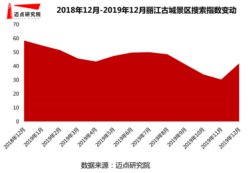 在反映潛在用戶關注的搜索指數(shù)上,本月麗江古城景區(qū)表現(xiàn)較為突出。經(jīng)邁點研究院數(shù)據(jù)監(jiān)測,12月麗江古城景區(qū)搜索指數(shù)高達42.04,環(huán)比增長38.47%,這表明旅游市場中關注該景區(qū)的潛在客群逐漸增多。