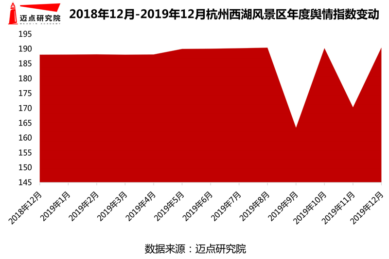 在反映實際客群關注度方面的輿情指數(shù)上,本月表現(xiàn)突出的是杭州西湖風景區(qū)。經(jīng)邁點研究院數(shù)據(jù)監(jiān)測,12月杭州西湖輿情指數(shù)高達190.49,環(huán)比增長11.81%。從全年該景區(qū)輿情指數(shù)變動來看,除9月及11月呈現(xiàn)小幅度下降之外,整體處于穩(wěn)步發(fā)展態(tài)勢。