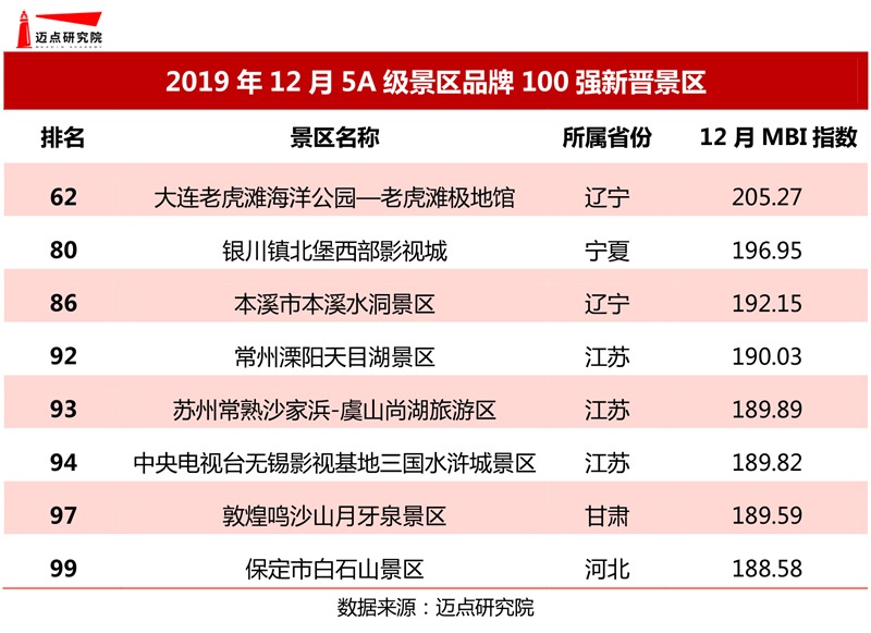 下是邁點研究院獨家發(fā)布的“2019年12月5A級景區(qū)品牌100強榜單”。月度5A級景區(qū)品牌百強榜單由邁點研究院研制,旨在通過數(shù)據(jù)解讀景區(qū)在互聯(lián)網(wǎng)及移動互聯(lián)網(wǎng)領域的影響力,為景區(qū)制定戰(zhàn)略方案提升品牌發(fā)展賦能。