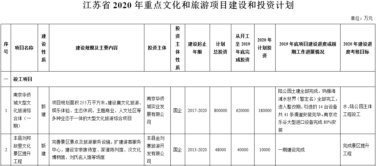 2月12日,江蘇省文化和旅游廳官網(wǎng)公布2020年江蘇省重點(diǎn)文化和旅游項(xiàng)目建設(shè)及投資計(jì)劃,南京華僑城大型文化旅游綜合體(一期)等60個(gè)文旅項(xiàng)目在列。