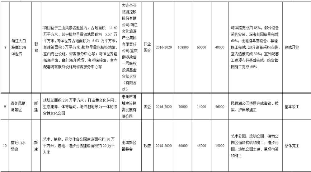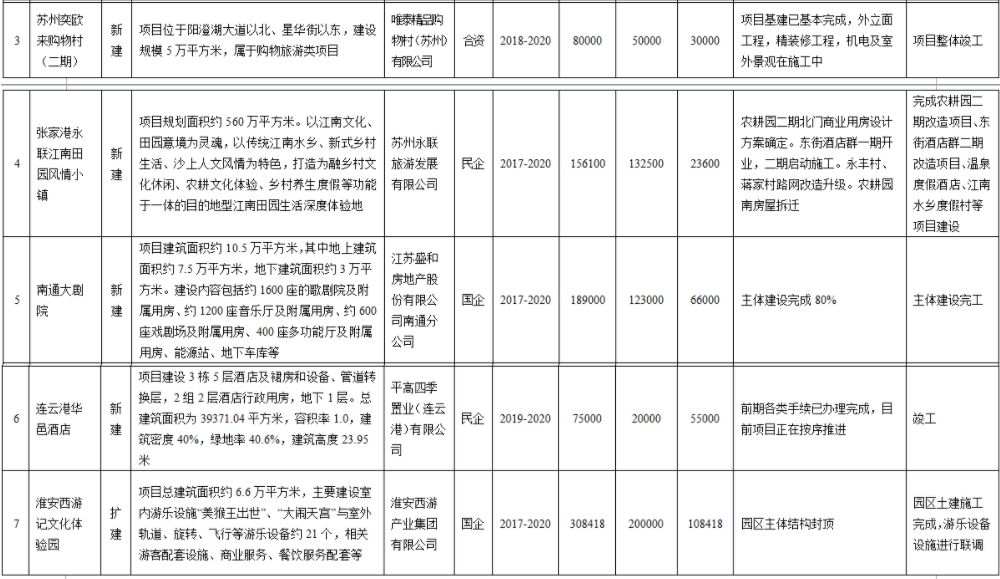 根據(jù)投資計(jì)劃,南京華僑城大型文化旅游綜合體(一期)、豐縣劉邦故里文化景區(qū)提升工程、蘇州奕歐來購(gòu)物村(二期)、張家港永聯(lián)江南田園風(fēng)情小鎮(zhèn)、南通大劇院、連云港華邑酒店、淮安西游記文化體驗(yàn)園、鎮(zhèn)江大白鯨魔幻海洋世界、泰州鳳棲湖景區(qū)、宿遷山水綠廊等10個(gè)項(xiàng)目將在今年竣工。