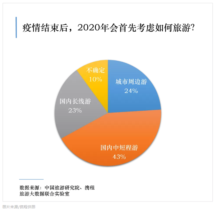 疫情結(jié)束后會(huì)先去哪里旅游?有90%以上的被調(diào)查者選擇國內(nèi)游。其中,城市周邊游、國內(nèi)中短程游、國內(nèi)長線游是主要選擇,分別占比24%、43%、23%。目前在線旅游平臺(tái)產(chǎn)品上線和預(yù)訂情況也符合這一趨勢(shì),景區(qū)門票、門票+酒店套餐、周邊游線路率先復(fù)蘇。