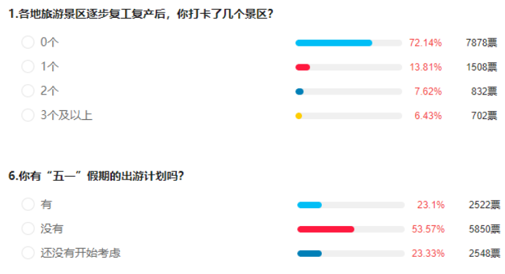 鳳凰網(wǎng)旅游的調(diào)查結(jié)果也印證了這一點,在被問及各地旅游景區(qū)逐步復(fù)工復(fù)產(chǎn)后的出游情況時,有72.14%的網(wǎng)友選擇了沒有出游,有49.85%的網(wǎng)友將出游的阻礙因素歸結(jié)為害怕人群聚集。對于即將到來的五一小長假,53.57%的網(wǎng)友不會出游,只有23.1%的人表示有相應(yīng)的出游計劃。