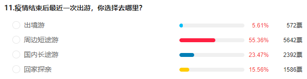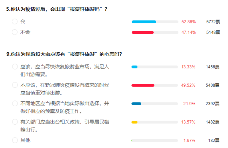 隨著旅游企業(yè)復(fù)工復(fù)產(chǎn)和清明假期部分景區(qū)景點游客爆滿現(xiàn)象的發(fā)生,近一段時間以來,有關(guān)疫情過后旅游報復(fù)性消費是否會到來的討論不絕于耳。對此,鳳凰網(wǎng)旅游發(fā)起了相關(guān)調(diào)查。截止到4月13日12時,總計有10920人參與了本次調(diào)查。調(diào)查統(tǒng)計數(shù)據(jù)顯示,各地旅游景區(qū)逐步復(fù)工復(fù)產(chǎn)后有72.14%的網(wǎng)友沒有出游,有49.85%的網(wǎng)友將出游的阻礙因素歸結(jié)為害怕人群聚集,52.14%的網(wǎng)友將年內(nèi)旅游花費預(yù)算選在了5000元以下,在是否應(yīng)該存在“報復(fù)性旅游消費”的心態(tài)上,超八成網(wǎng)友不支持報復(fù)性旅游消費,不到二點五成選擇“五一”出游 。