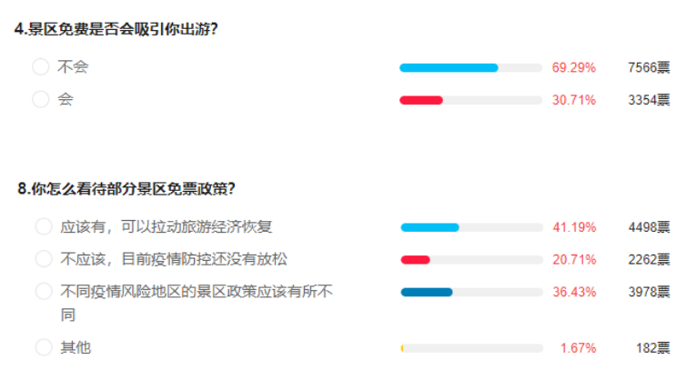 在有關(guān)景區(qū)門票的問題調(diào)查中,有超過三分之二的網(wǎng)友認(rèn)為景區(qū)免票在現(xiàn)階段并不構(gòu)成吸引自己出游的主要因素,在景區(qū)免票政策的利弊中,41.19%的網(wǎng)友覺得可以通過免票政策來拉動旅游經(jīng)濟(jì)恢復(fù)。