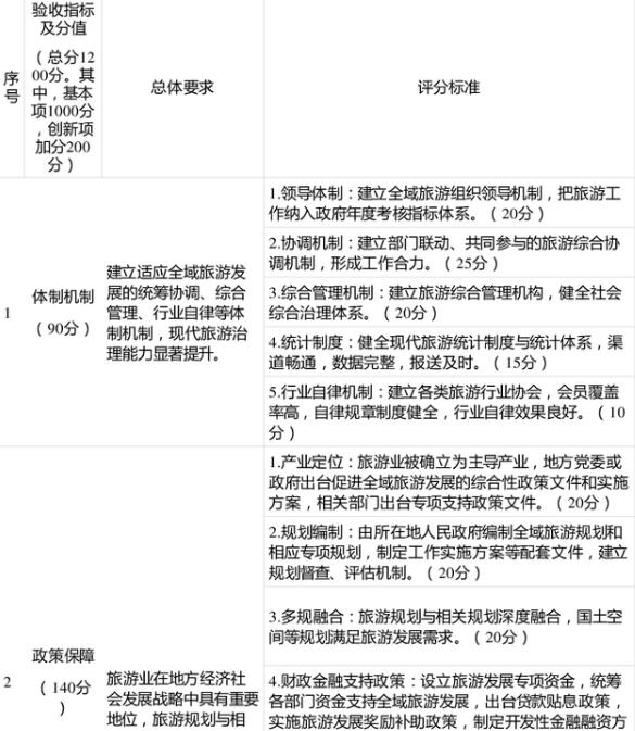 第八條 文化和旅游部制定《國家全域旅游示范區(qū)驗(yàn)收標(biāo)準(zhǔn)(試行)》(以下簡稱《標(biāo)準(zhǔn)》)。《標(biāo)準(zhǔn)》基本項(xiàng)目總分1000分,創(chuàng)新項(xiàng)目加分200分,共計(jì)1200分。通過省級文化和旅游行政部門初審驗(yàn)收的最低得分為1000分。