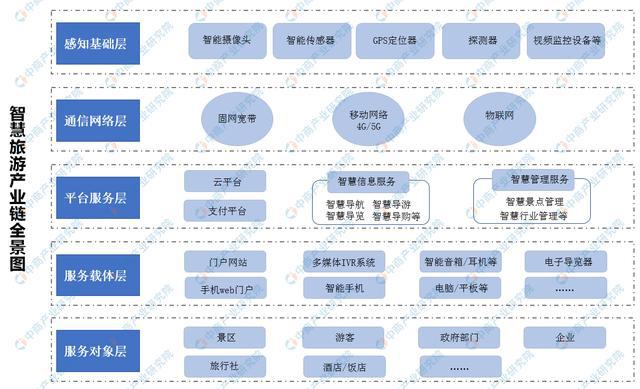 智慧旅游產(chǎn)業(yè)鏈所涉及的環(huán)節(jié)復(fù)雜、行業(yè)眾多,大大超出了傳統(tǒng)旅游行業(yè)的范疇。從結(jié)構(gòu)來看,智慧旅游產(chǎn)業(yè)鏈中既有水平供需關(guān)系,也存在垂直協(xié)作關(guān)系。同時(shí),隨著技術(shù)的不斷提升、需求更新,持續(xù)不斷有新的企業(yè)進(jìn)入產(chǎn)業(yè)鏈。中商產(chǎn)業(yè)研究院整理了我國(guó)智慧旅游產(chǎn)業(yè)鏈圖主要包括:感知基礎(chǔ)層、通信網(wǎng)絡(luò)層、平臺(tái)服務(wù)層、服務(wù)載體層以及服務(wù)對(duì)象層五大層面,如下圖所示: