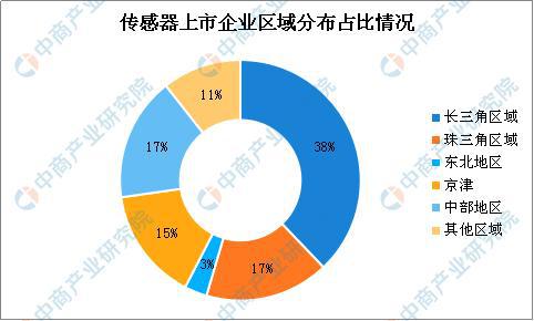 傳感器市場(chǎng)前景廣闊,國(guó)內(nèi)企業(yè)紛紛布局其中。目前,我國(guó)傳感器上市企業(yè)多達(dá)66家,主要集中在長(zhǎng)三角區(qū)域。此外,珠三角區(qū)域、京津地區(qū)、中部地區(qū)分布相當(dāng)。據(jù)統(tǒng)計(jì),長(zhǎng)三角區(qū)域傳感器上市企業(yè)占比達(dá)38%,有企業(yè)25家;珠三角區(qū)域占比17%,有企業(yè)11家;中部地區(qū)同樣占比17%,有企業(yè)11家;京津地區(qū)占比15%,有企業(yè)10家;東北地區(qū)占比3%,有企業(yè)2家。