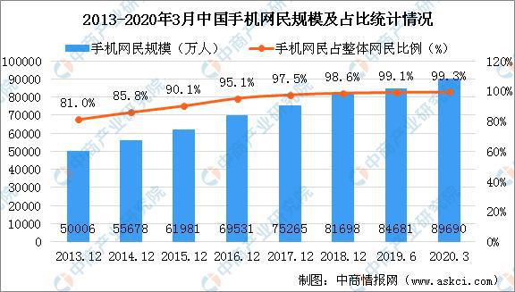 截至2020年3月,我國(guó)手機(jī)網(wǎng)民規(guī)模為8.97億,較2018年底新增手機(jī)網(wǎng)民7992萬(wàn),網(wǎng)民中使用手機(jī)上網(wǎng)的比例為99.3%,較2018年底提升0.7個(gè)百分點(diǎn)。