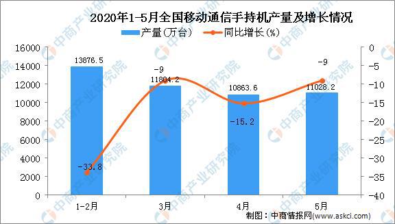 據(jù)中商產(chǎn)業(yè)研究院數(shù)據(jù)庫(kù)顯示,2020年5月全國(guó)移動(dòng)通信手持機(jī)產(chǎn)量下降,2020年5月全國(guó)移動(dòng)通信手持機(jī)產(chǎn)量為11028.2萬(wàn)臺(tái),同比下降9%。2020年1-5月全國(guó)移動(dòng)通信手持機(jī)產(chǎn)量為46323.9萬(wàn)臺(tái),同比下降16.5%。