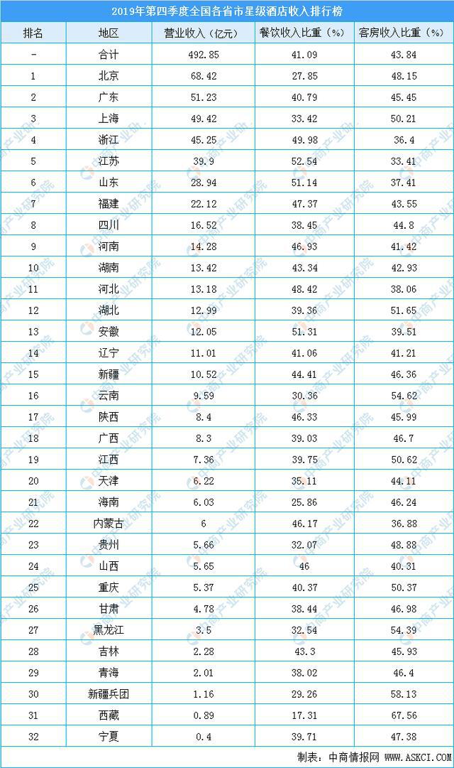 從2019第四季度各地區(qū)星級(jí)酒店經(jīng)營(yíng)情況看,共有2個(gè)地區(qū)營(yíng)收超50億元,分別是北京68.42億元,其中餐飲收入占比27.85%,客房收入占比48.15%;廣東521.23億元排名第二。上海市195家星級(jí)酒店實(shí)現(xiàn)營(yíng)業(yè)收入49.42億元,排名第三。另外,全國(guó)共有15個(gè)地區(qū)營(yíng)收超10億元。