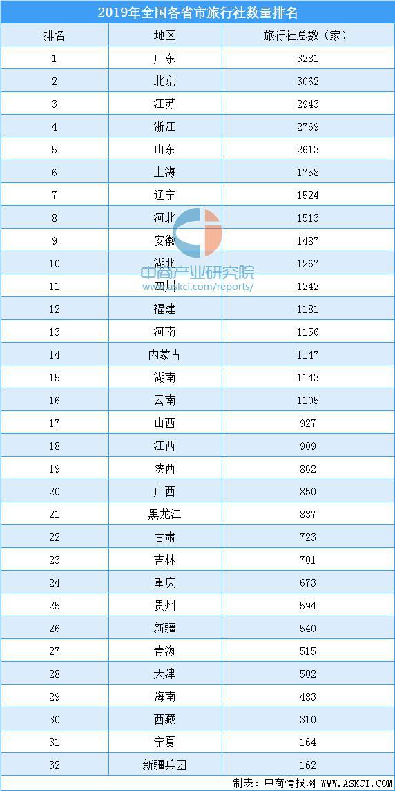 從全國(guó)旅行社分布來看,東部地區(qū)和西部地區(qū)旅行社數(shù)量較多,合計(jì)占全國(guó)旅行社總量超70%。旅行社數(shù)量在2500家以上的有5個(gè)地區(qū),分別為廣東、北京、江蘇、浙江和山東,數(shù)量最多的廣東為3281家。海南、西藏、寧夏、新疆兵團(tuán)4個(gè)地區(qū)旅行社數(shù)量少于500家,最少的新疆兵團(tuán)為162家。旅行社數(shù)量在500-1000家的有12個(gè)地區(qū),1000-1500家的有8個(gè)地區(qū),1500-2000家的有3個(gè)地區(qū)。2019年全國(guó)各省市旅行社數(shù)量排名如下:
