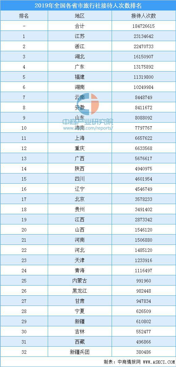 從各省市旅行社接待人次數(shù)來看,2019年全國(guó)旅行社共接待人數(shù)18472.66萬(wàn)人次。從接待人次來看,江蘇省接待游客人數(shù)最多,全年共接待人數(shù)2313.46萬(wàn)人次,位列全國(guó)第一。浙江接待人次2247.07萬(wàn)人次,排名第二位。湖北以接待人數(shù)1615.09萬(wàn)人次排名第三位。2019年全國(guó)各省市旅行社接待人次數(shù)排名如下: