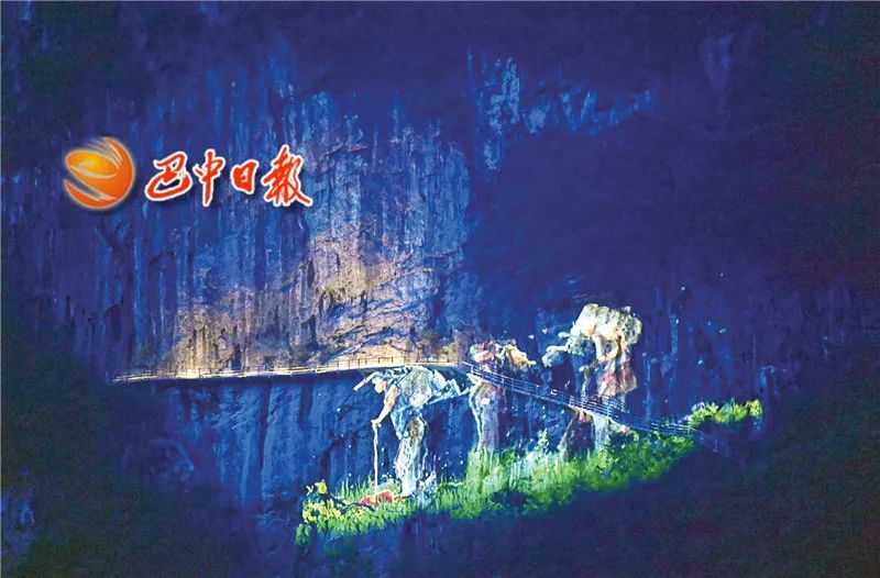 崖壁上投影出巴山背二哥不屈不撓的形象