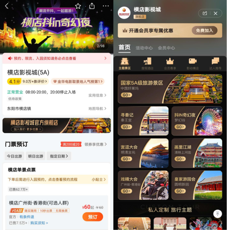 同時(shí),結(jié)合橫店影視IP,橫店影視城會(huì)員旗艦店還為不同的會(huì)員群體量身定制了游橫店的主題旅行項(xiàng)目,如朋友閨蜜游、劇中人物體驗(yàn)游、情侶浪漫游、暖心父母游、家庭親子度假游等。追星達(dá)人還可以搶購爆款橫店劇組見面會(huì)門票,來場(chǎng)影視追劇游。在橫店影視城會(huì)員旗艦店里,將圍繞其“影視基因”結(jié)合影視主題酒店、經(jīng)典景區(qū)和特色美食,傳達(dá)橫店影視城玩在電影里、住在電影里、吃在電影里、購在電影里的“影視體驗(yàn)度假區(qū)”品牌形象。