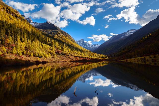秋日的阿壩州,充斥著五彩斑斕的“熱鬧”,金黃的樹(shù)葉、火紅的彩林交織在一起,與雪山海子相映成趣。