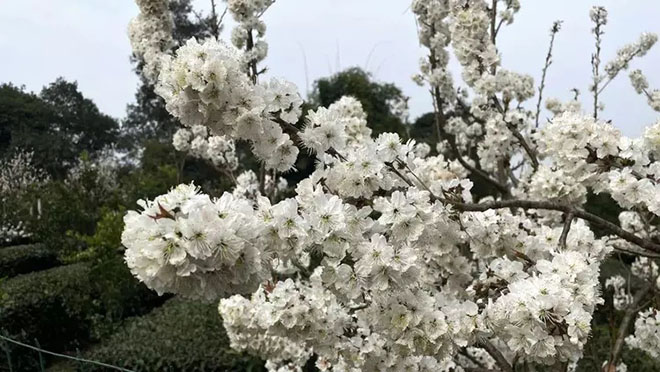 在鶴山街道櫻桃山景區(qū),1.2萬(wàn)畝如云似雪的櫻桃花鋪滿山間,白綠交融的爛漫花海蔚為壯觀。春風(fēng)拂過(guò),花瓣輕揚(yáng)如雨、春意爛漫,一幅美麗的春日畫(huà)卷徐徐展開(kāi),無(wú)數(shù)游客慕名而來(lái),讓人流連忘返。賞櫻桃花、聞花香,游客沉醉在迷人的花海里,感受愜意的春日美景。