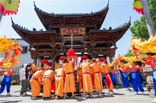 六百公里外的桐廬翙崗古村,西邊廳廣場正上演一場剛?cè)岵奈幕瘜υ?。非遺民俗表演《翙崗龍舞》以磅礴氣勢喚醒沉睡的古建筑群,越劇《張郎你聽我從實講》的婉轉(zhuǎn)唱腔與武術(shù)《精忠報國》的鏗鏘招式交織,在古戲臺上重構(gòu)歷史場景。國家級傳承人劉蓮花手中的桐廬剪紙,隨剪刀起落化作栩栩如生的富春山水,引得游客紛紛舉起手機記錄。