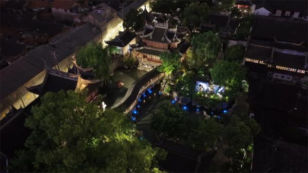 踏入豫園2號(hào)門,仿佛按下“次元穿梭鍵”,百年亭臺(tái)樓閣在光影交錯(cuò)間化身國創(chuàng)宇宙,游客在九曲橋的漣漪里看見《百妖譜》桃夭的倒影,在明代演武場舊址聽到《鎮(zhèn)魂街》的熱血宣言。凝暉路的千盞燈籠暈染出《天官賜?!窐O樂坊的暖光,湖心亭的檐角輪廓在3D mapping投影中時(shí)隱時(shí)現(xiàn)。