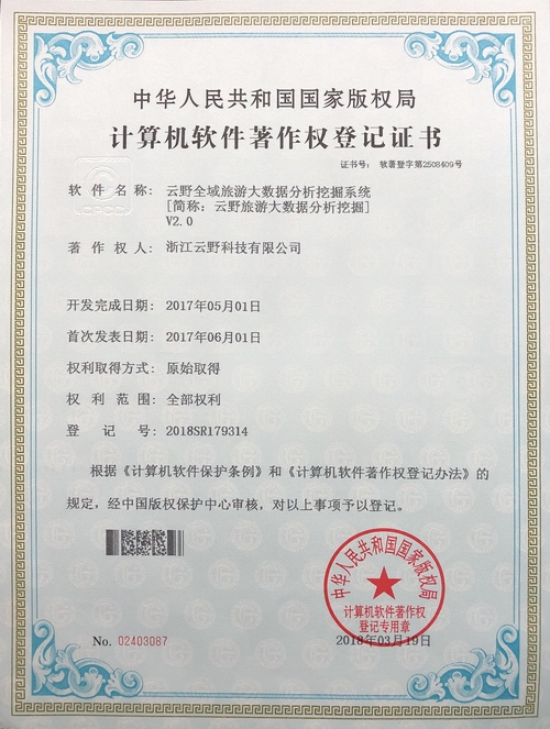 《云野智慧旅游云數(shù)據(jù)中心系統(tǒng)V2.0》于2018年3月14日被正式授予《中華人民共和國國家版權(quán)局計(jì)算機(jī)軟件著作權(quán)登記證書》,登記號(hào)為2018SR167714。