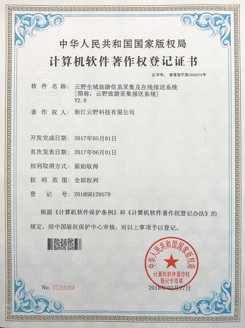 《云野全域旅游信息采集及在線報(bào)送系統(tǒng)V2.0》于2018年2月27日被正式授予《中華人民共和國國家版權(quán)局計(jì)算機(jī)軟件著作權(quán)登記證書》,登記號(hào)為2018SR129579。