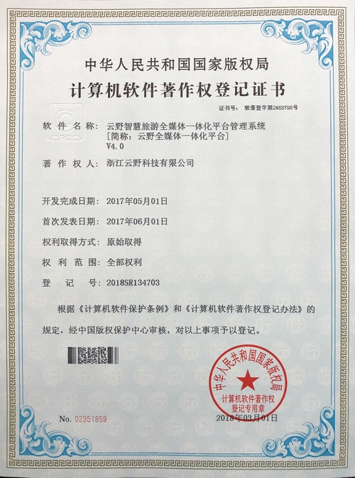 《云野智慧旅游全媒體一體化平臺(tái)管理系統(tǒng)V4.0》于2018年3月1日被正式授予《中華人民共和國國家版權(quán)局計(jì)算機(jī)軟件著作權(quán)登記證書》,登記號(hào)為2018SR134703。