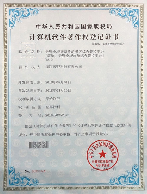 《云野全域智慧旅游綜合集成管理服務(wù)平臺(tái)V2.0》于2019年4月19日被正式授予《中華人民共和國國家版權(quán)局計(jì)算機(jī)軟件著作權(quán)登記證書》,登記號(hào)為2019SR0352516。